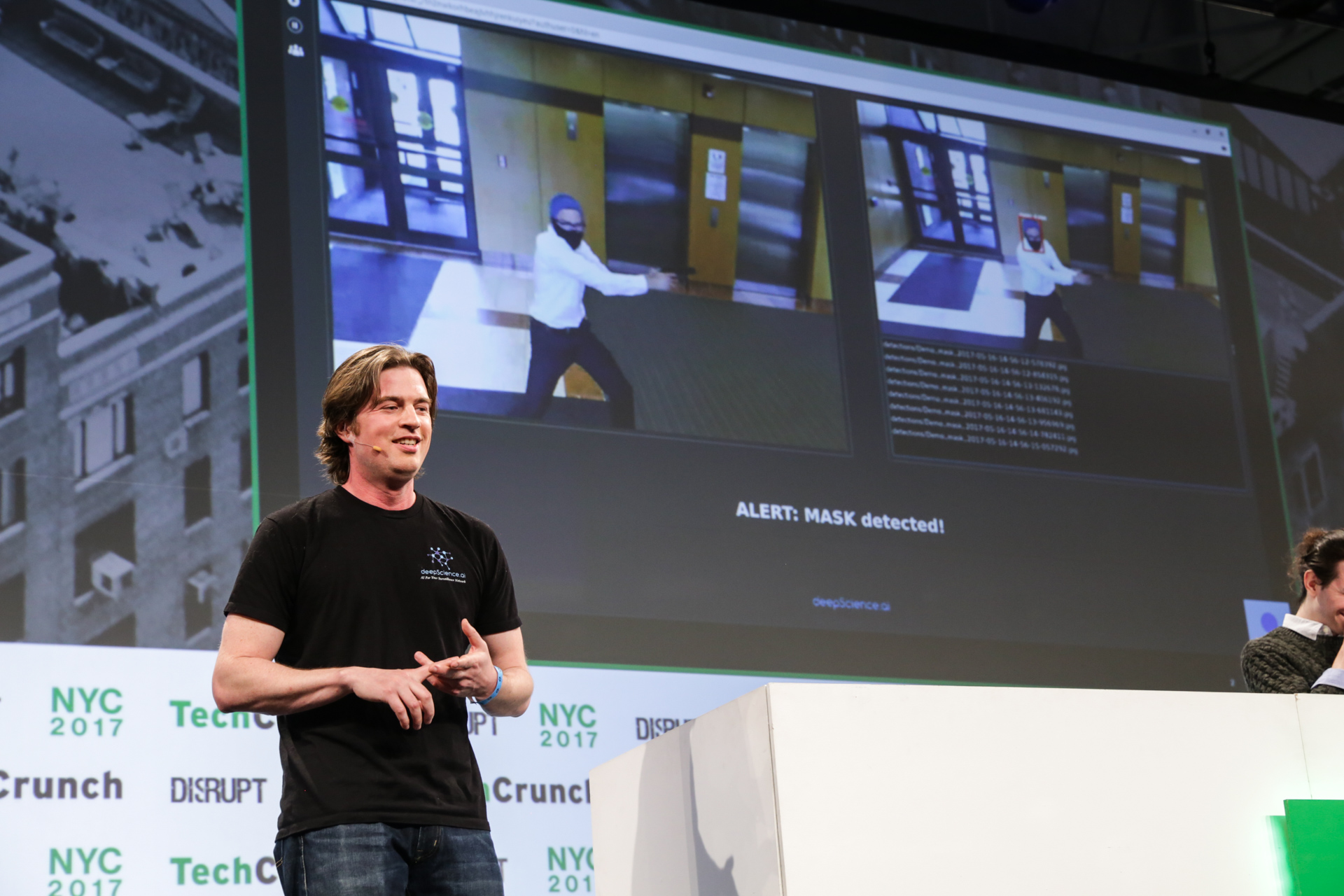 Although the company was still only in prototype phase when it was on stage, the success of its live demo with a team member setting off an alert in a live feed (gutsy to attempt this) indicated that it was actually functional — unlike, as Sullivan discovered, many other companies advertising the same thing.