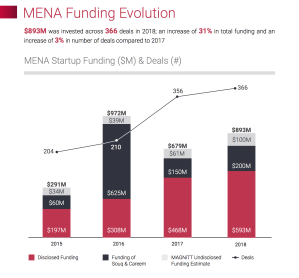 The trend-line for investments in the Middle East continues to move up and to the right. Last year there were 366 investments made in Middle Eastern startups — the highest number on record. And those deals managed to raise 31 percent more than their 2017 total, with $893 million in capital committed, according to the region’s industry tracker, Magnitt.
