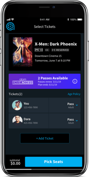 The new platform, called Atom Movie Access, will be offered to exhibitors across North America. It provides a fully digitally booking platform for subscribers through the Atom Tickets app. That means subscribers can also take advantage of Atom Tickets’ other benefits — like reserving seats in advance, inviting friends through their contacts, pre-ordering concessions for quick pickup where available and checking in using a phone instead of paper tickets.