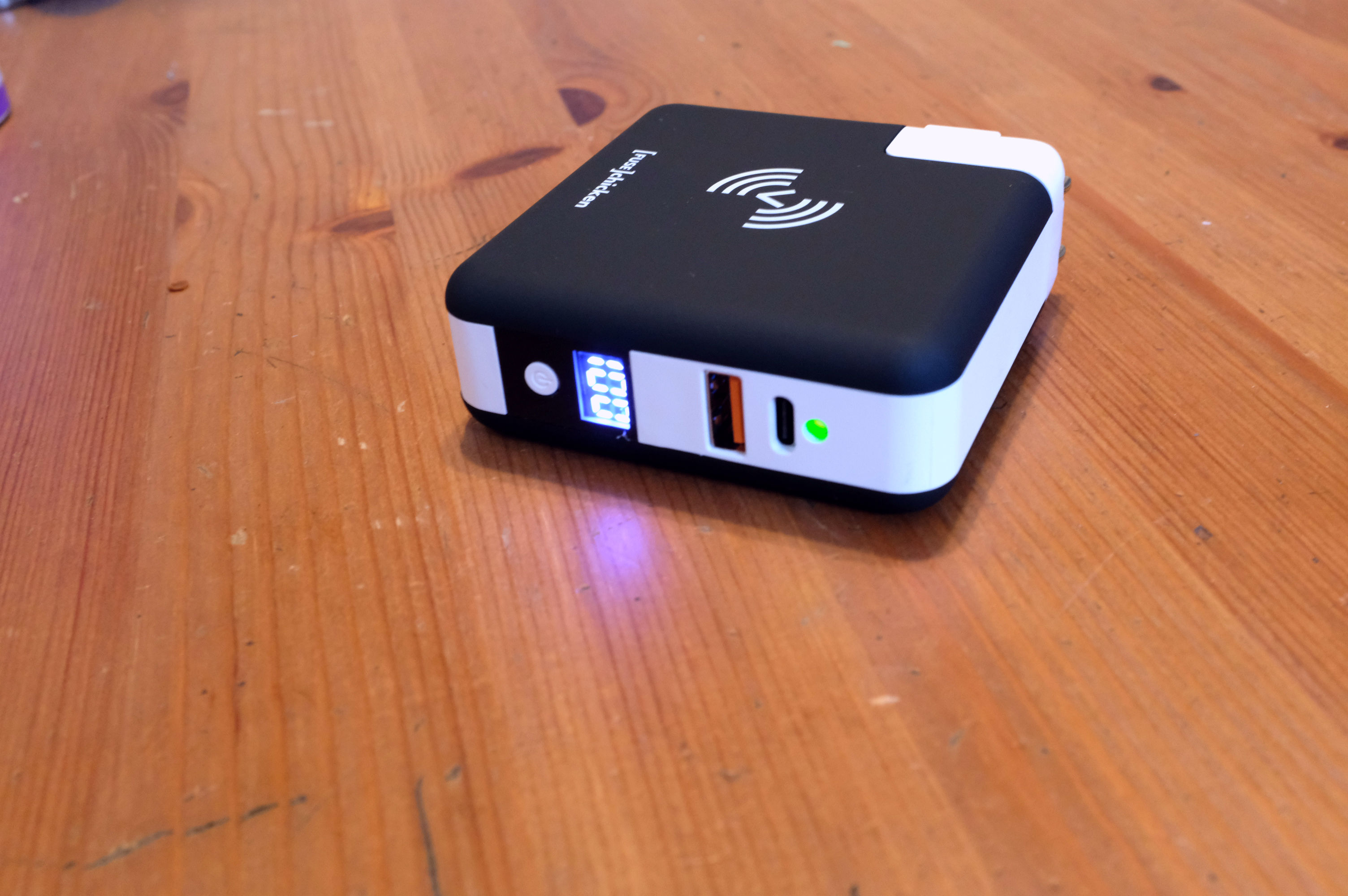But the brick also sports a 6,700 mAh battery inside, so you can continue charging gadgets while unplugged. That’s ideal for a phone — you can keep a laptop alive for a bit as well, but you’re going to burn through that pretty quickly. There’s also a wireless charging pad up top, so you can power up another phone or, say, a new set of AirPods at the same time. The side of the device features a small display showing how much juice is left.