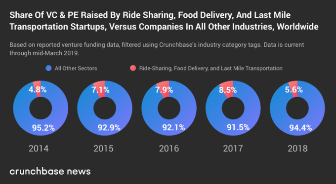 Of all the seed, early and late-stage venture funding raised over the past couple of years, how much of the total went to companies in the ride-hailing, food delivery and last-mile transportation categories (which encompasses bikes and scooters)? Probably not as much as you’d think.