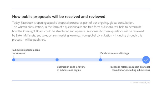 In November, Facebook announced its plans to create an external content oversight board that would serve as something of a “supreme court” for Facebook’s more controversial content policy decisions. With the release of a draft charter in January, the company took the first steps to describe how this content review board would function. Today, Facebook is opening a public consultation process to help it answer more questions around the oversight board’s design.