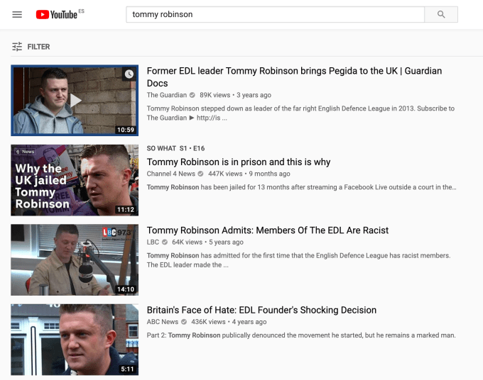 Test searches for ‘Tommy Robinson’ on YouTube now return a series of news reports — instead of Yaxley-Lennon’s own channel, as was the case just last month.