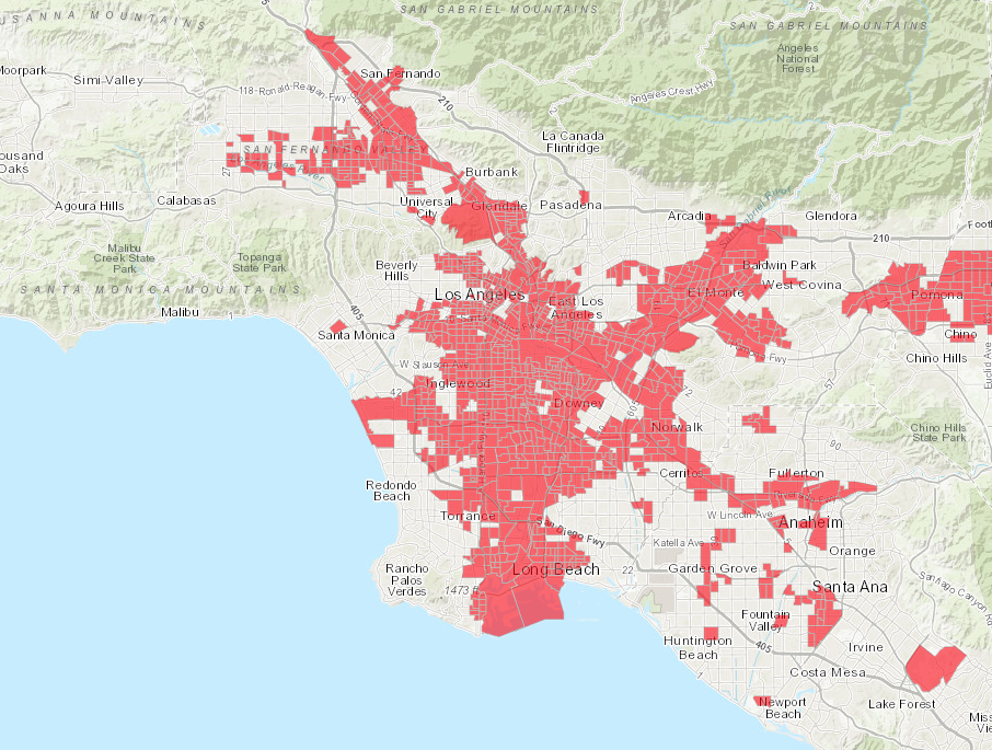 As determined by the California Office of Environmental Health Hazard Assessment, disadvantaged communities entail places with socioeconomic disparities, as well as those that are disproportionately impacted by environmental pollution and public health effects. Below, you can see which areas (marked in red) in Los Angeles are considered disadvantaged communities.