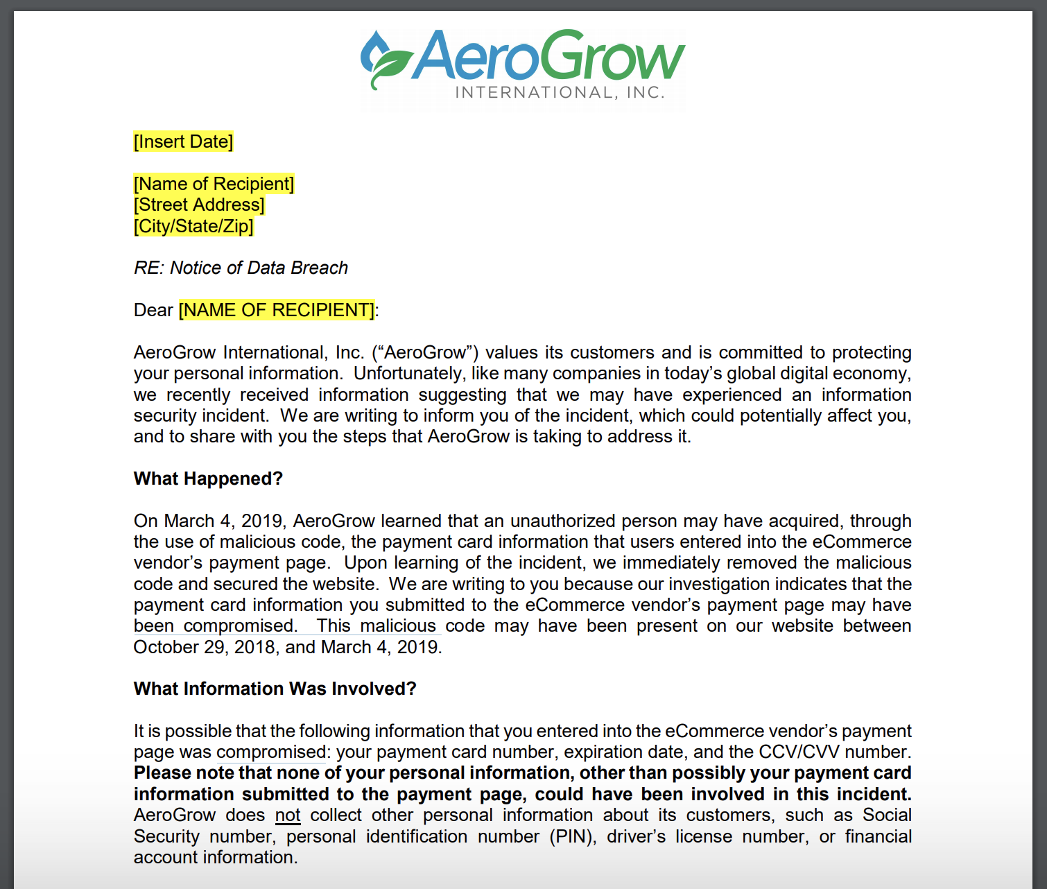 AeroGrow, the maker of the at-home garden kit AeroGarden, said in a letter to customers that its website had credit card scraping malware for more than four months.