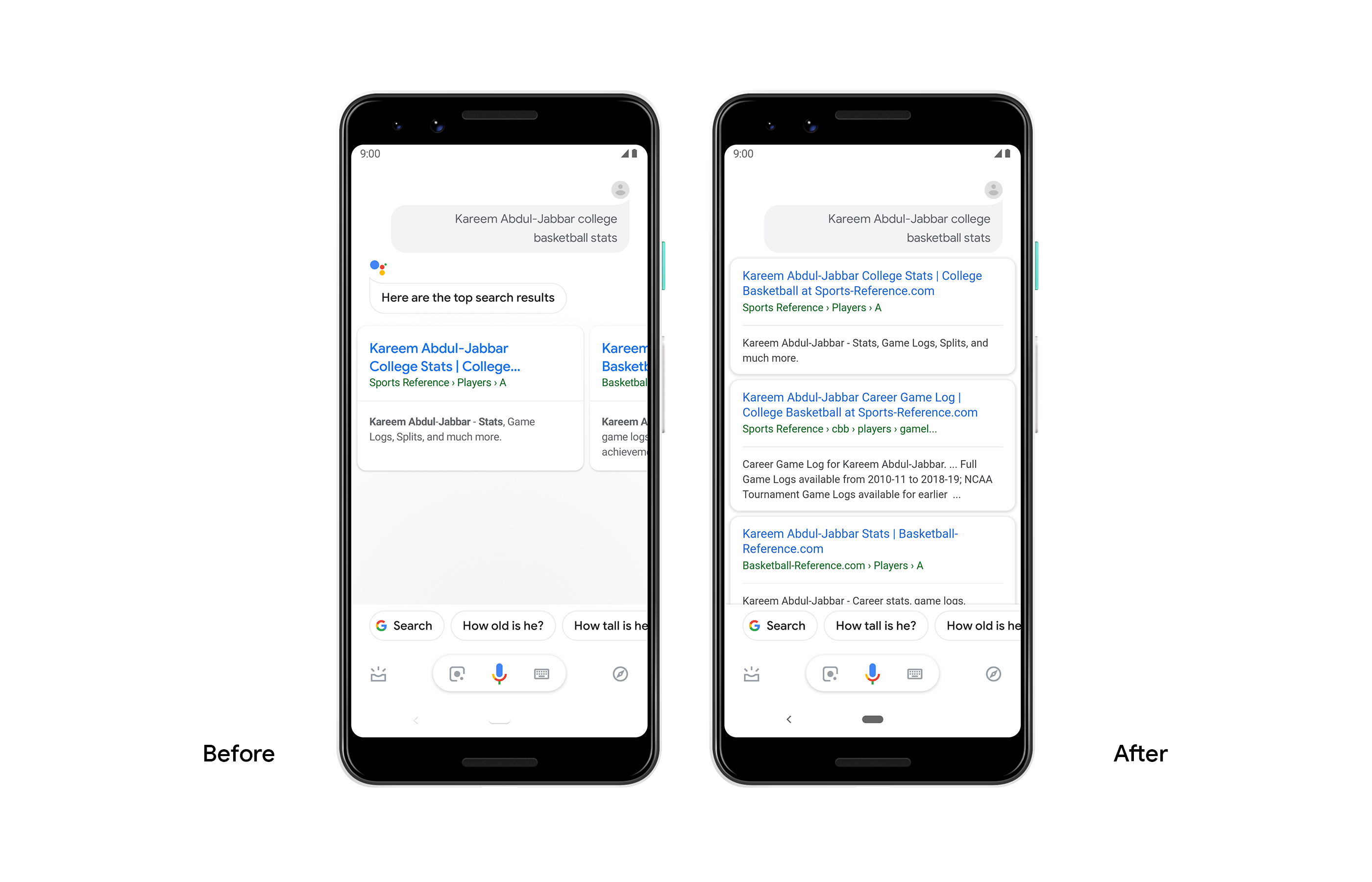 Also — and this is going to be a bit of a controversial change — when the Assistant decides that the best answer is simply a list of websites (or when it falls back to those results because it simply doesn’t have any other answer), the Assistant used to show you a couple of boxes in a vertical layout that were not exactly user-friendly. Now, the Assistant will simply show the standard Google Search layout.