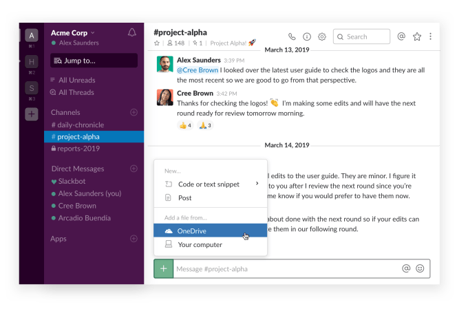 Slack’s goal of integrating enterprise tools in the chat interface has been a major differentiator from the giant companies it’s competing with like Microsoft and Facebook. Last year, it bought Astro, specifically with the goal of integrating enterprise productivity tools inside Slack, and today it announced new integrations with Microsoft OneDrive and Outlook.