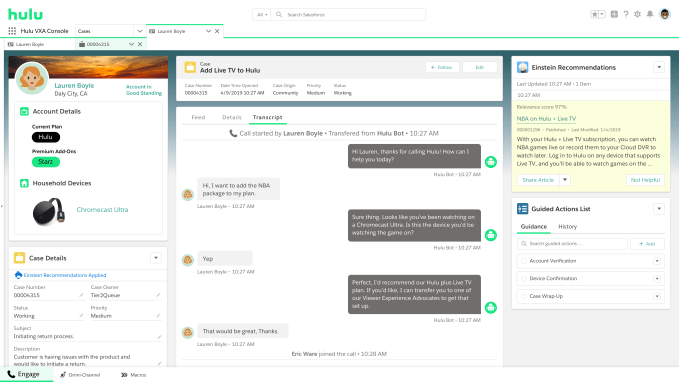 The Google software will understand voice and intent, and have access to a set of external information like weather or news events that might be having an impact on the customers, while Salesforce looks at the hard data it stores about the customer such as who they are, their buying history and previous interactions.