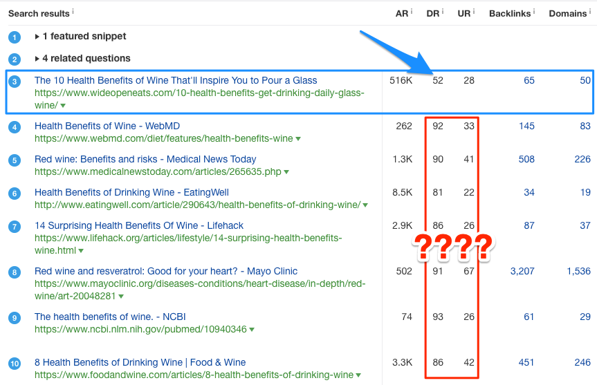 Here’s a screenshot showing how small publishers can beat out large behemoths today — with very little Domain Ranking: