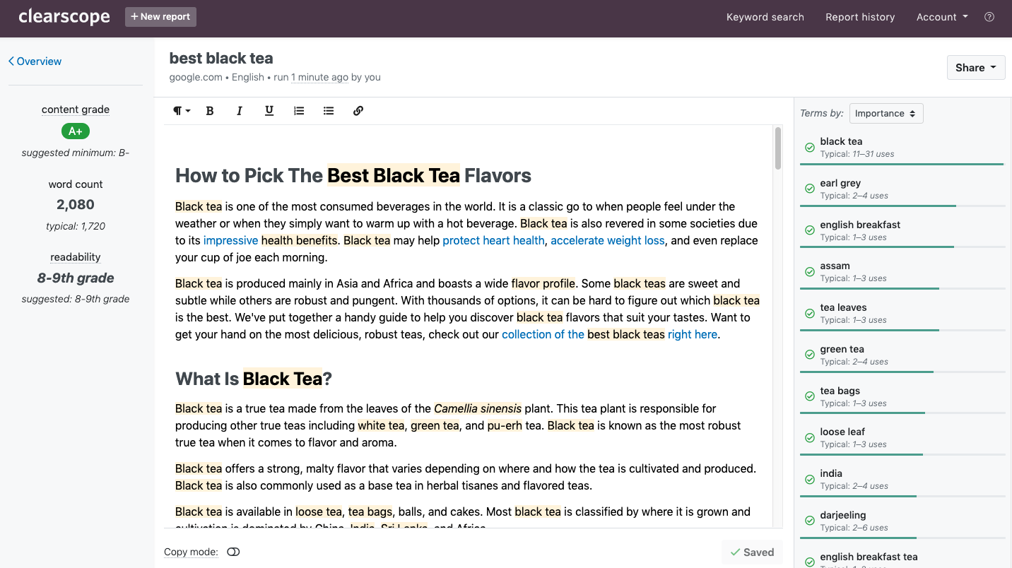This is what we use Clearscope for — it ensures we don’t miss critical subtopics that help our posts rank: