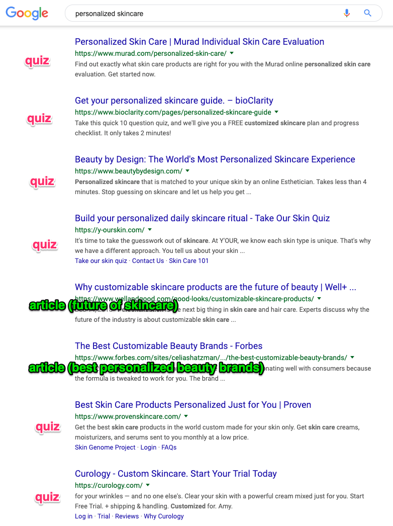 So if you don’t perform a check like this before writing an article on “personalized skincare,” there’s a good chance you’re wasting your time. Because, for some queries, Google has begun prioritizing local recommendations, videos, quizzes, or other types of results that aren’t articles.