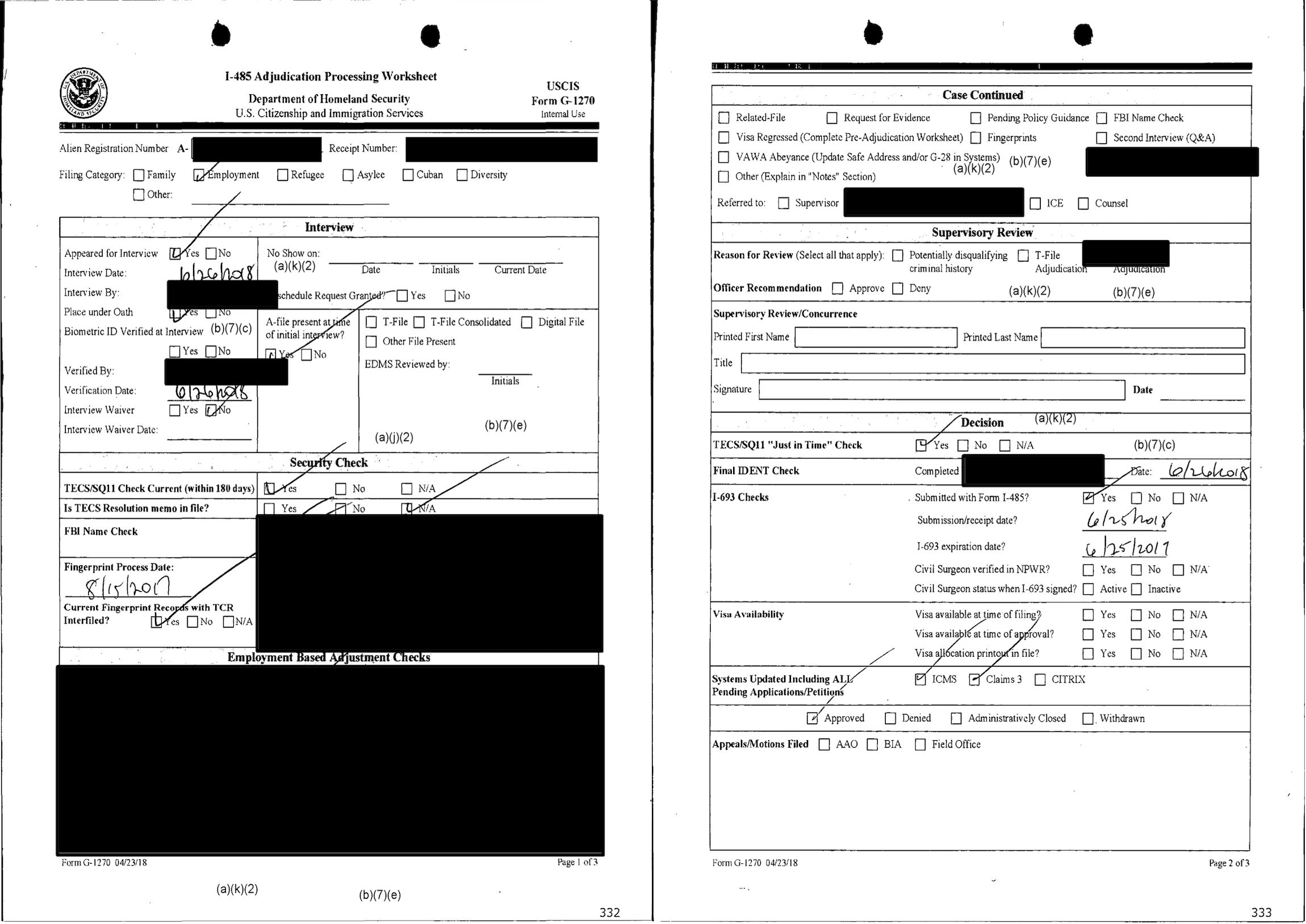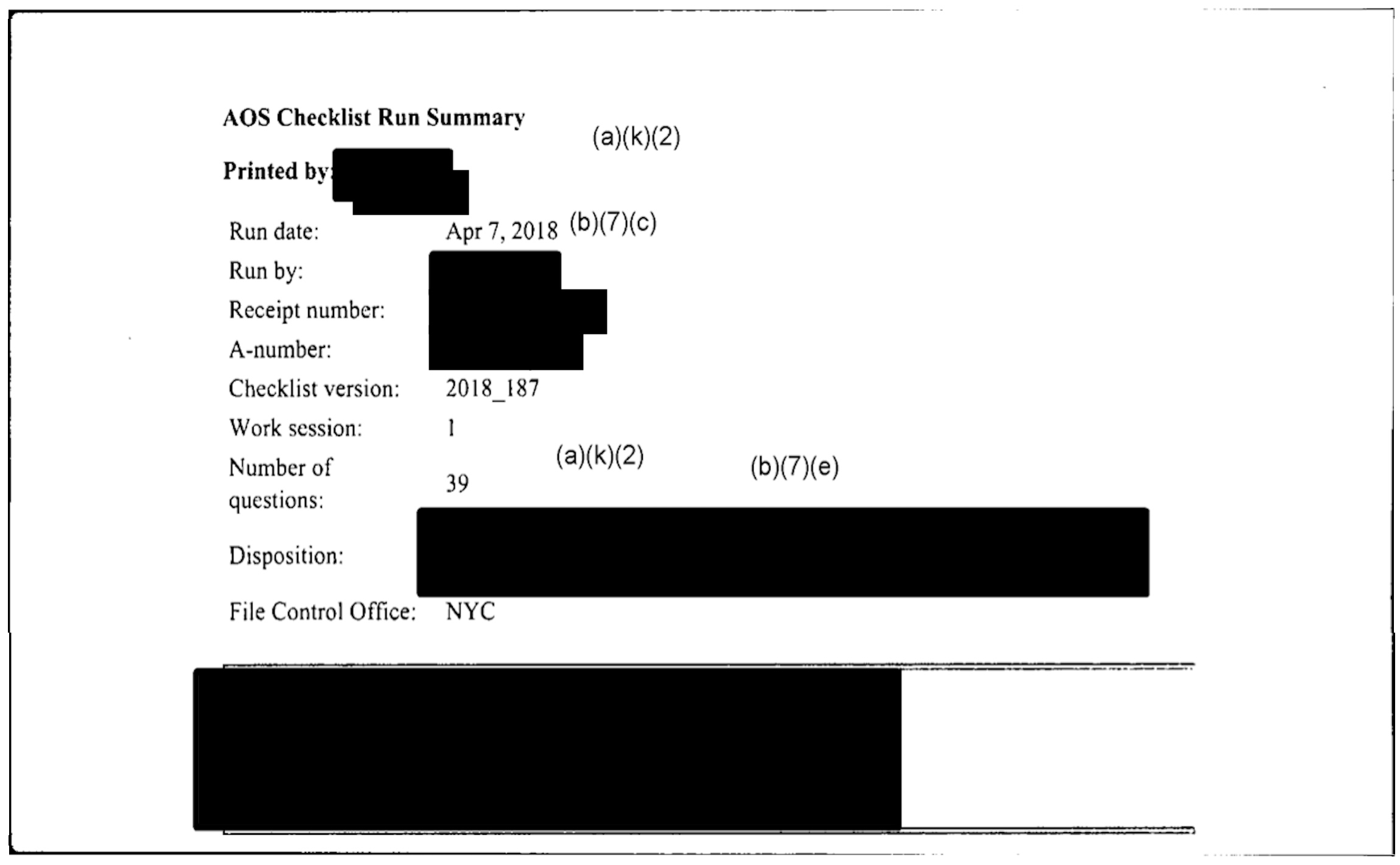 USCIS sent me a disk with 561 pages of documents and a cover letter telling me most of the interesting bits were redacted, citing exemptions such as records relating to officers and government staff, investigatory material compiled for law enforcement purposes and techniques used by the government to decide an applicant’s case.