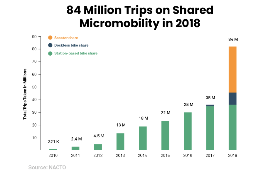 Shared electric scooters are close to overtaking bike sharing, according to the National Association of City Transportation Officials. In 2018, of the 84 million micromobility trips taken, 38.5 million of those were on scooters.