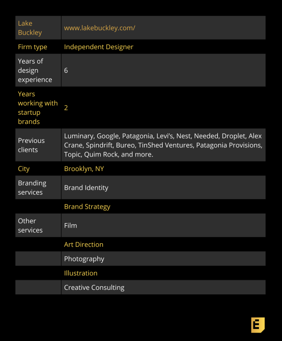 Lake Buckley: I started to work with startups because I had friends in companies that needed work, and I needed clients. I enjoyed the creative freedom and they saw an opportunity to apply the skills I had developed up to that point for a very cheap price. I took everything I learned, worked really hard and hoped for the best.