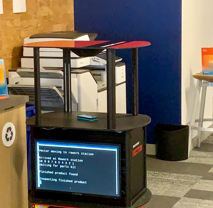 Another project involved a partnership with Waypoint Robotics, where they demonstrated a robot that worked alongside human workers. The humans interacted with the robots, but the robot moved the goods from workstation to workstation, acting as a quality control agent along the way. If it found defects or problems, it communicated that to the worker via a screen on the side of the unit, and to the cloud. Every interaction between the humans, goods and robot was updated in the Oracle cloud.
