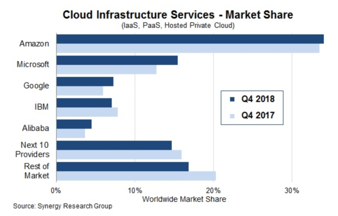 “For cloud infrastructure services (IaaS, PaaS, hosted private cloud services) — Oracle has a 2 percent share,” John Dinsdale, chief analyst and managing director at Synergy told TechCrunch. He added, “It is a top-10 player, but it is nowhere near the scale of the leading cloud providers; and its market share has been steadily eroding.”