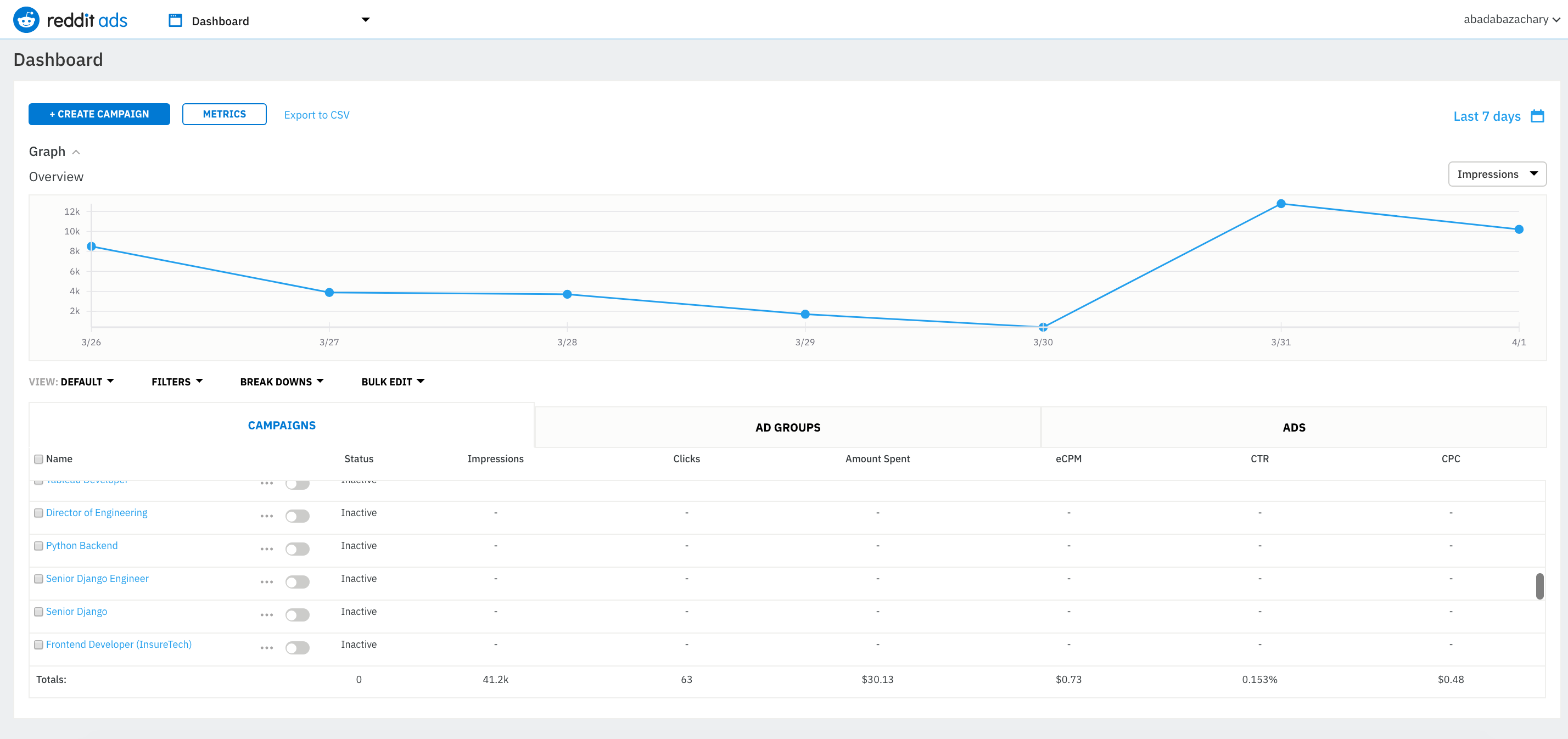 Blended, when it comes to spending money on Reddit, we’ve found that we typically pay $0.47 for a click, and get on average 7% application completion rate, netting an average cost of $6.70, 5% of whom are worthwhile of screening. Even if your team doesn’t already have ads as a skill, the margins are so good when it’s working that it’s extremely cost-effective. Thanks, ad technology!