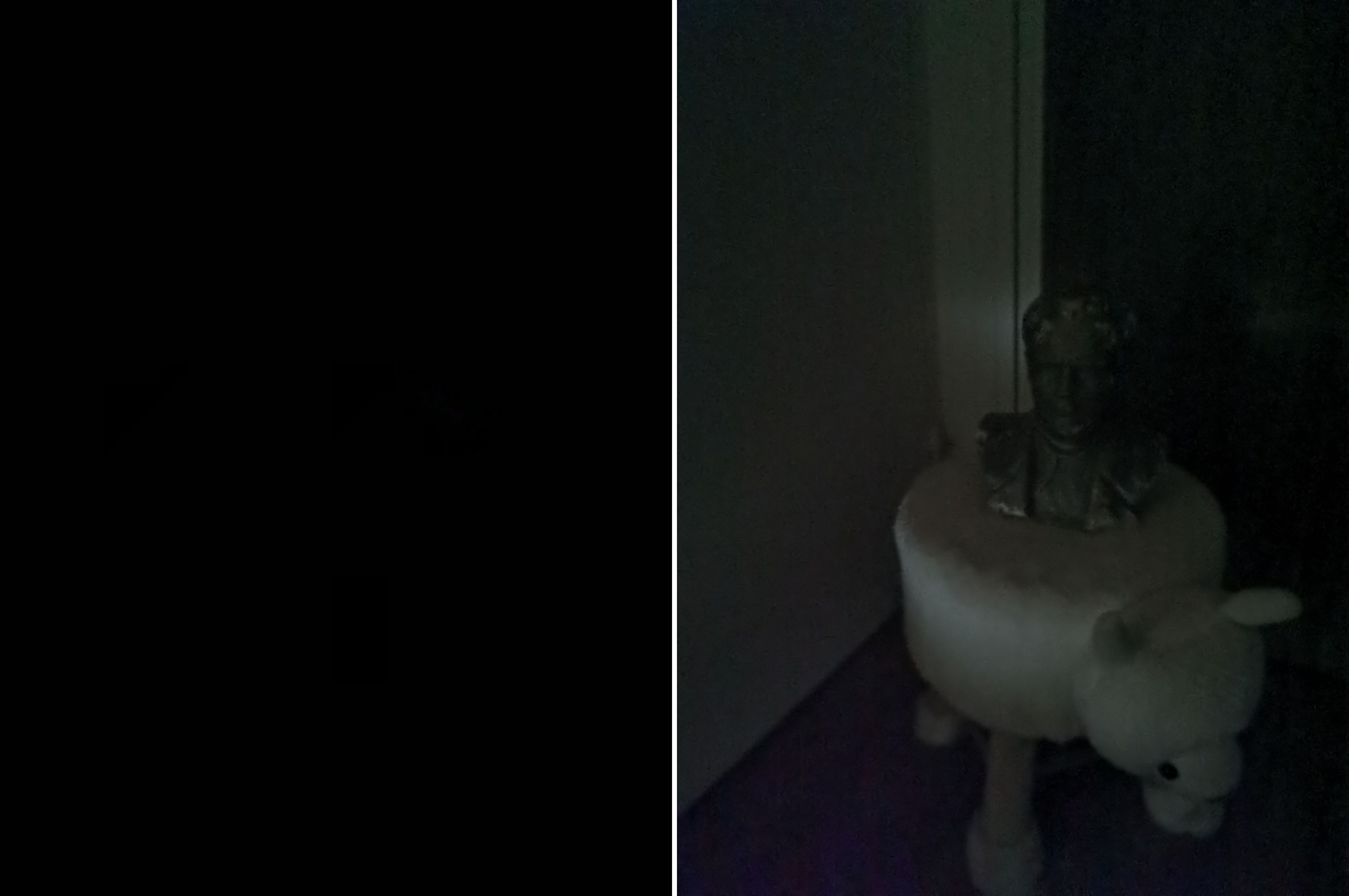 In addition to hardware improvements, Huawei has also worked on the algorithms that process your shots. Night mode performs incredibly well. You just have to hold your phone for 8 seconds so that it can capture as much light as possible. Here’s what it looks like in a completely dark room vs. an iPhone X: