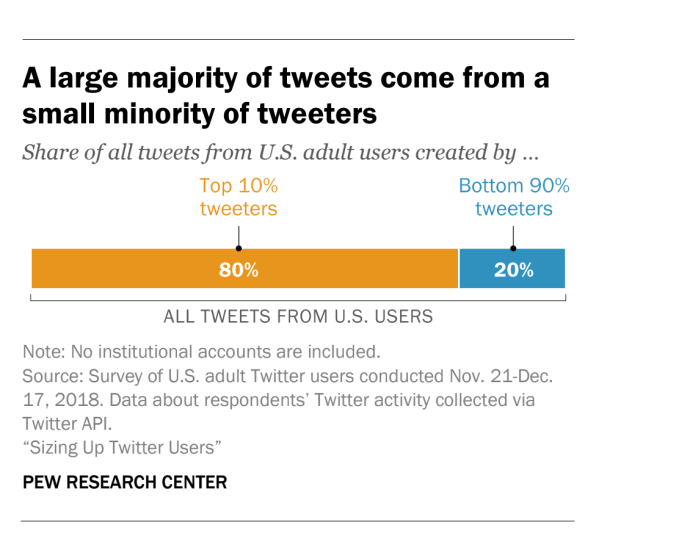 That means the conversation on Twitter is dominated by extremely active (or, in their parlance, “extremely online“) users. That means a large majority of Twitter’s content is created by a small number — 10 percent of users are responsible for 80 percent of all tweets from U.S. adults on Twitter.