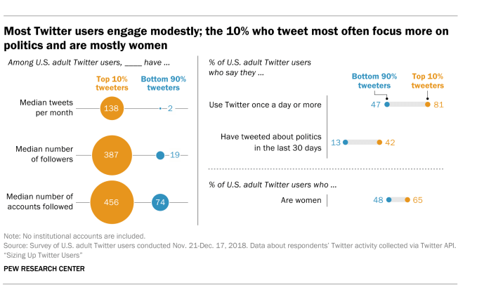 In addition to the makeup of the adult population on Twitter, Pew also researched the activity on the platform and found that the median user only tweets twice per month.