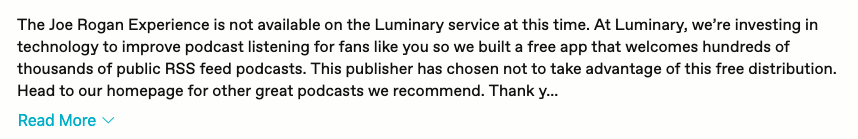 That’s a bad look from Luminary. A simple “The Joe Rogan Experience is not available on the Luminary service at this time” would have sufficed here. Instead the service chose to grind its axe on the page of a show that never asked to be there in the first place. As a new startup in the space, Luminary would be well suited to listen to podcasters, as it hopes to draw in more talent for original content.