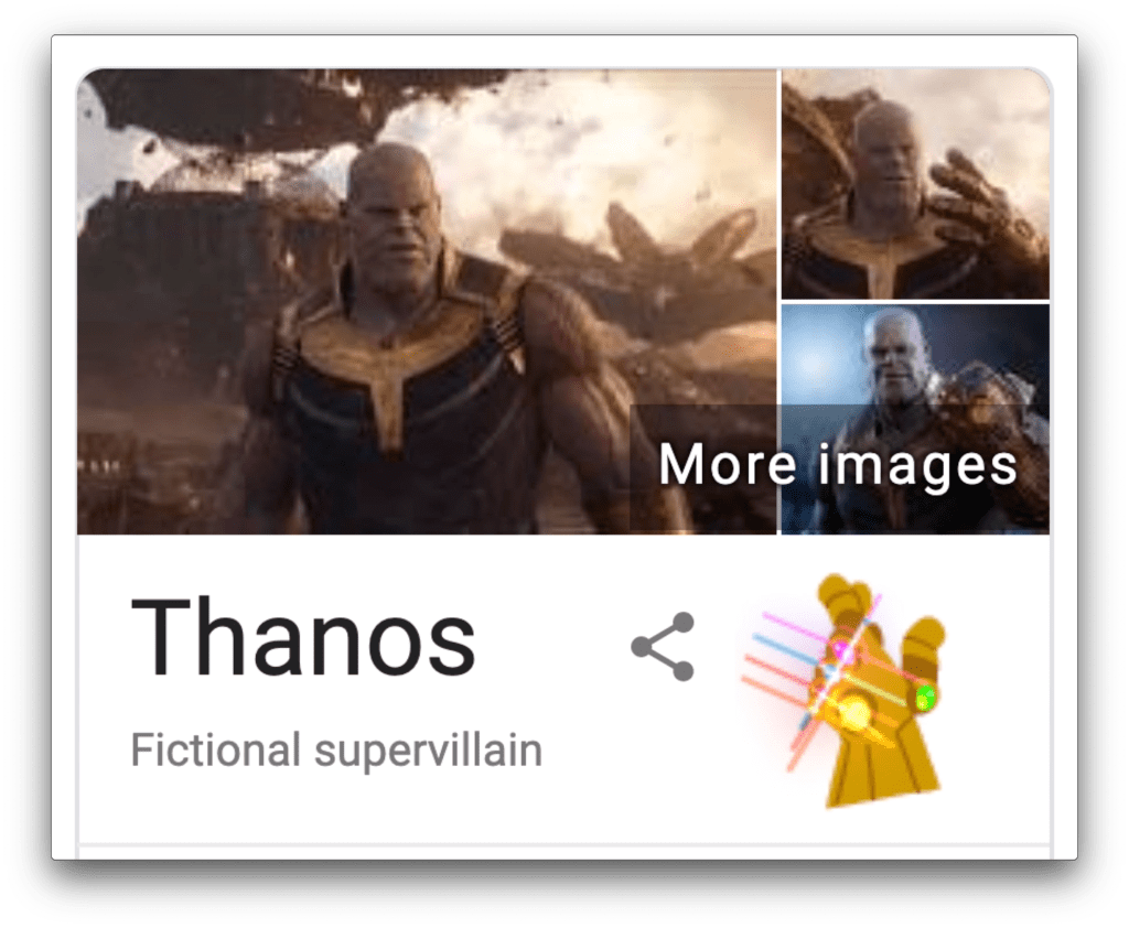 Go to Google (don’t worry, I’ll wait). Type in “Thanos.” Click the little cartoon Infinity Gauntlet on the right side. Now sit back in horror as Evil Space Grimace snaps half of your search results into dust in the wind.