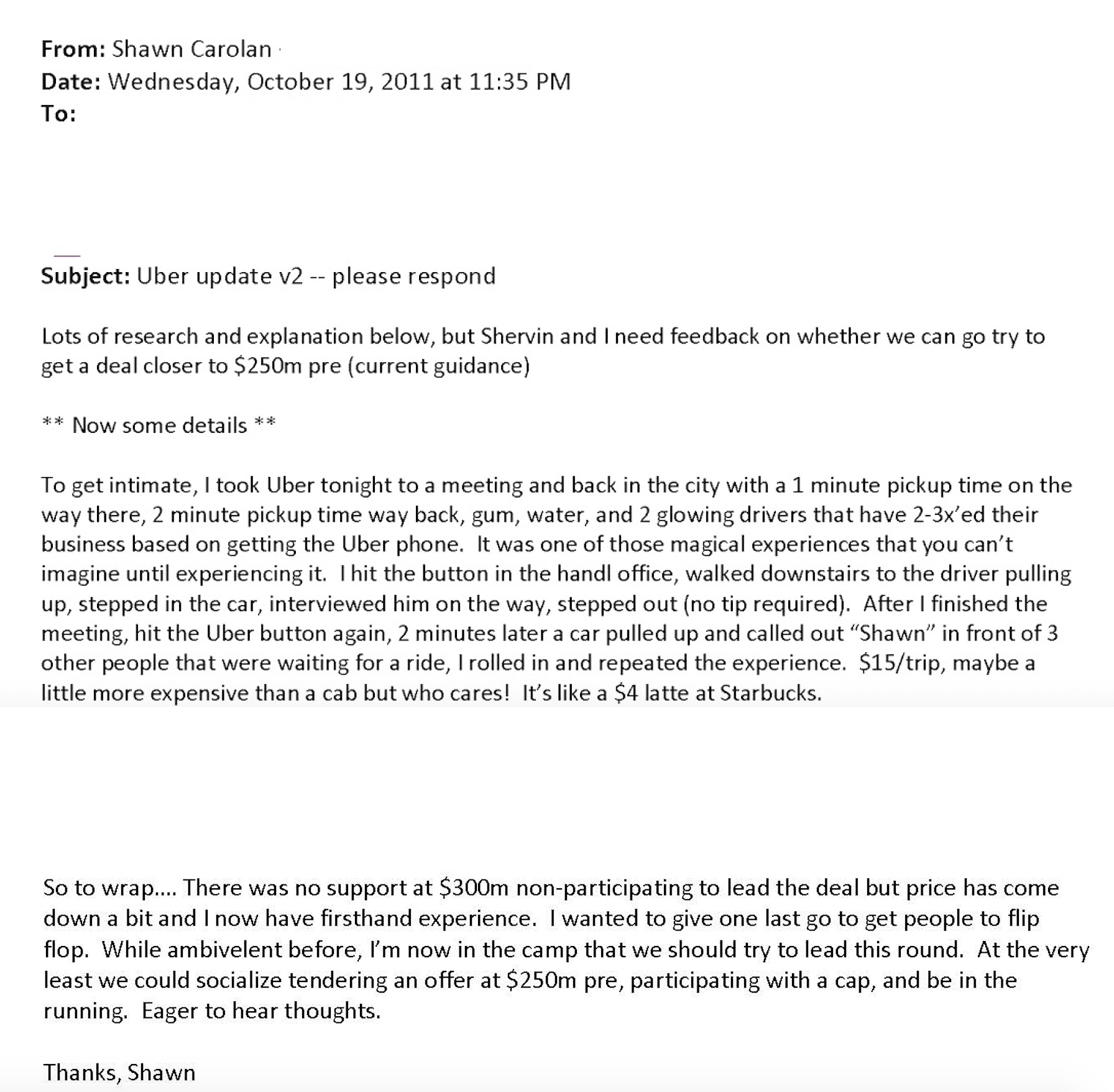 Meanwhile, Carolan was heads down, benchmarking Uber against other tech companies, completing a thorough unit economics analysis and hoping his colleagues wouldn’t be disappointed by the Uber investment, a point of contention among certain Menlo staffers who viewed Uber as a limo dispatch company with an app, not the next billion-dollar business.