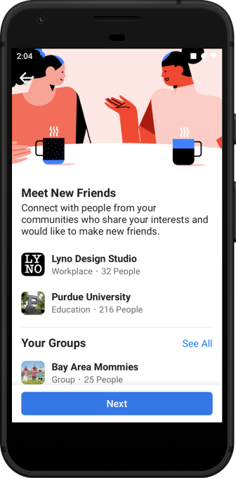 Fidji Simo, the head of Facebook’s main app, tells me Meet New Friends was based on emerging behaviors the company had spotted. “Developing relationships with people they didn’t already know is very different from the core use case of Facebook,” but she notes, “We’ve already seen that naturally happen in Groups, and Meet New Friends will make that a bit easier.”