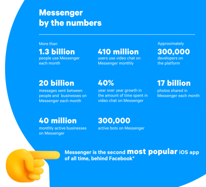 Facebook is also beefing up its tools for the 40 million active businesses and 300,000 developers on Messenger, up from 200,000 developers a year ago. Merchants will be able to let users book appointments at salons and masseuses, collect information with new lead generation chatbot templates and provide customer service to verified customers through authenticated m.me links. Facebook hopes this will boost the app beyond the 20 billion messages sent between people and businesses each month, which is up 10X from December 2017.
