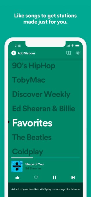 As you listen to music on Stations, you can thumbs up and down songs in order to have it create custom stations personalized to you — including a Discover Weekly playlist, Release Radar and a Favorites playlist.