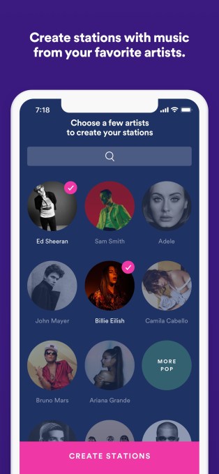 The Stations app today features a range of playlists by genre, decade, activity and more, but also becomes personalized to the end-user over time. You can also opt to create your own stations by selecting from favorite artists in an experience that’s reminiscent of the customization offered today by YouTube Music — right down to the rounded artist profile photos you tap on.