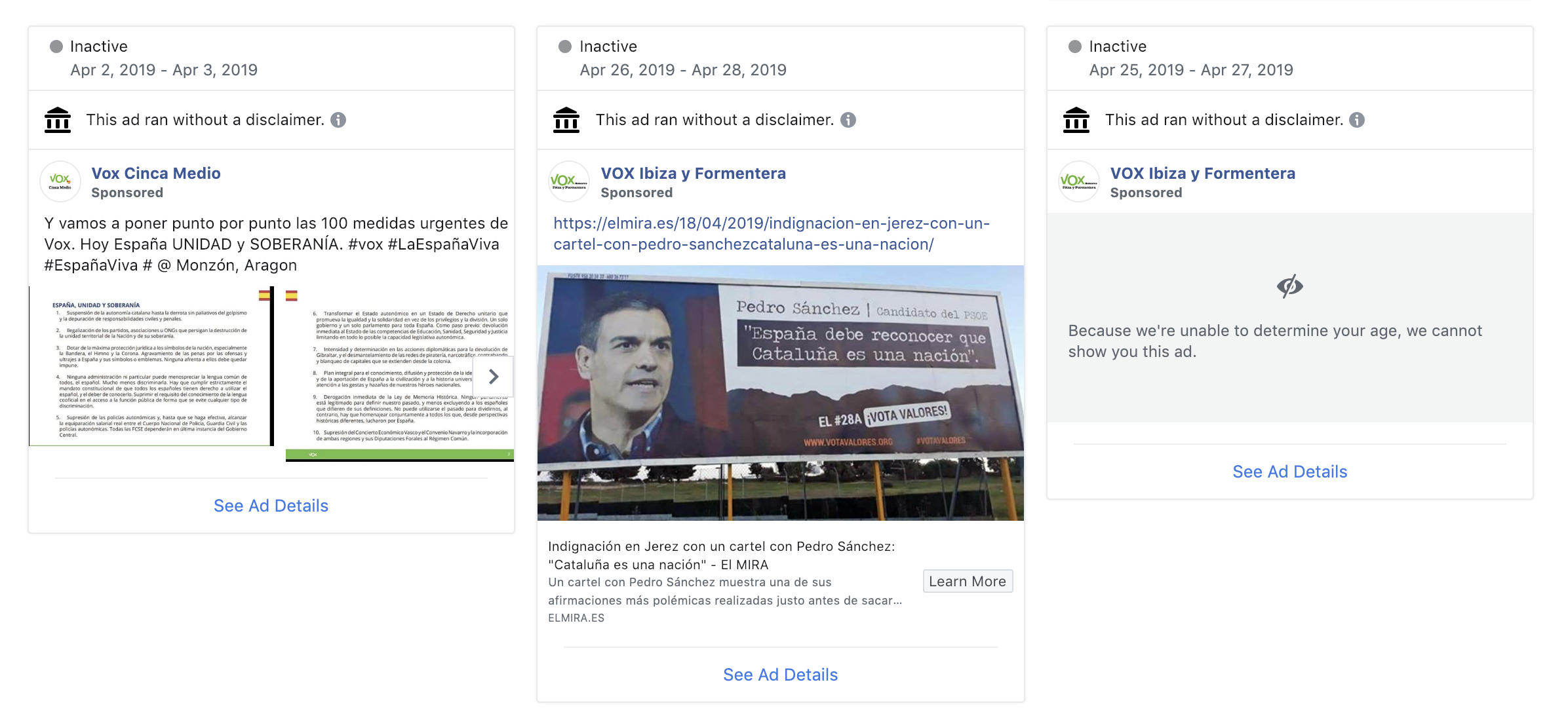 There are multiple examples of inactive ads for the Spanish far right party Vox visible in Facebook’s Ad Library that were pulled for running without the required disclaimer label, for example.