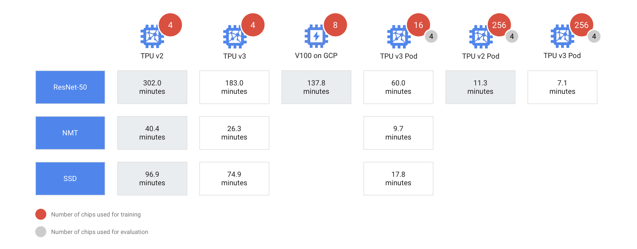 The TPU v2 Pods feature up to 512 cores and are a bit slower than the v3 ones, of course. When using 265 TPUs, for example, a v2 Pod will train the ResNet-50 model in 11.3 minutes while a v3 Pod will only take 7.1 minutes. Using a single TPU, that’ll take 302 minutes.