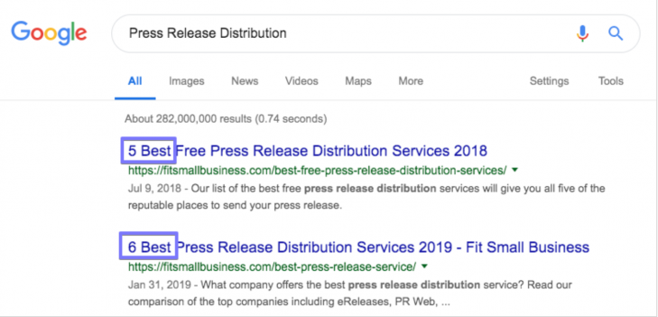 Here’s a great example of that from the world of PR. Even broad search terms such as ‘Press Release Distribution’ will pull up ‘best list’ articles: