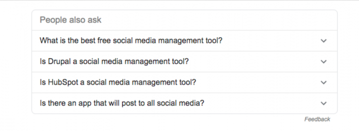 As a good example, the search query ‘social media management tool’ features a lot of competing services. The ‘People Also Ask’ box shows further questions some searches are having: