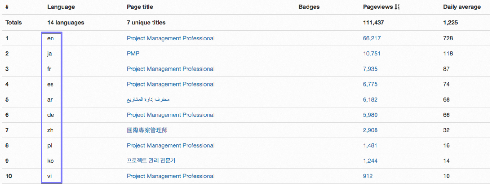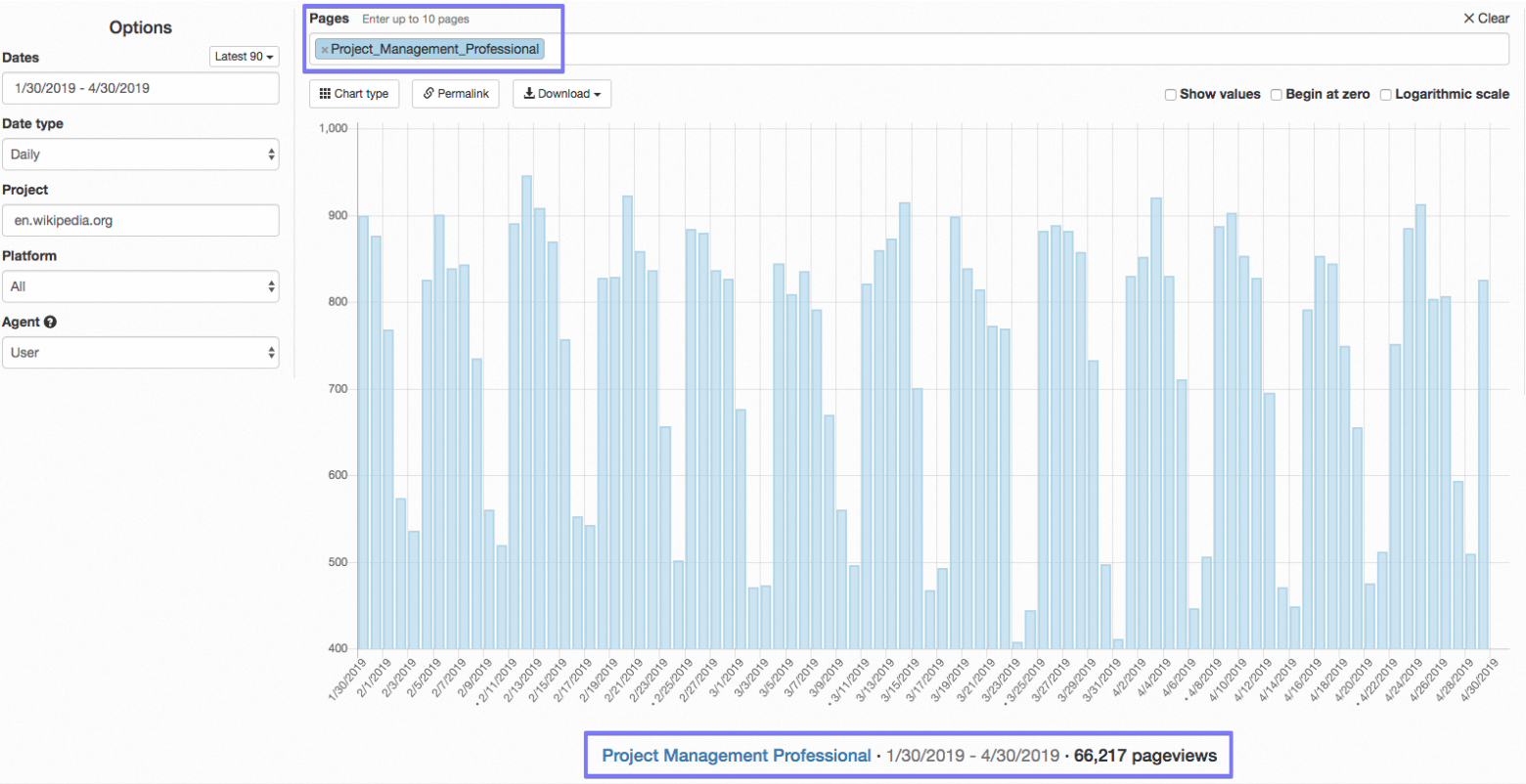 Below, we can see that over the last 90 days, their English-language page on project management professional has been viewed over 60,000 times.