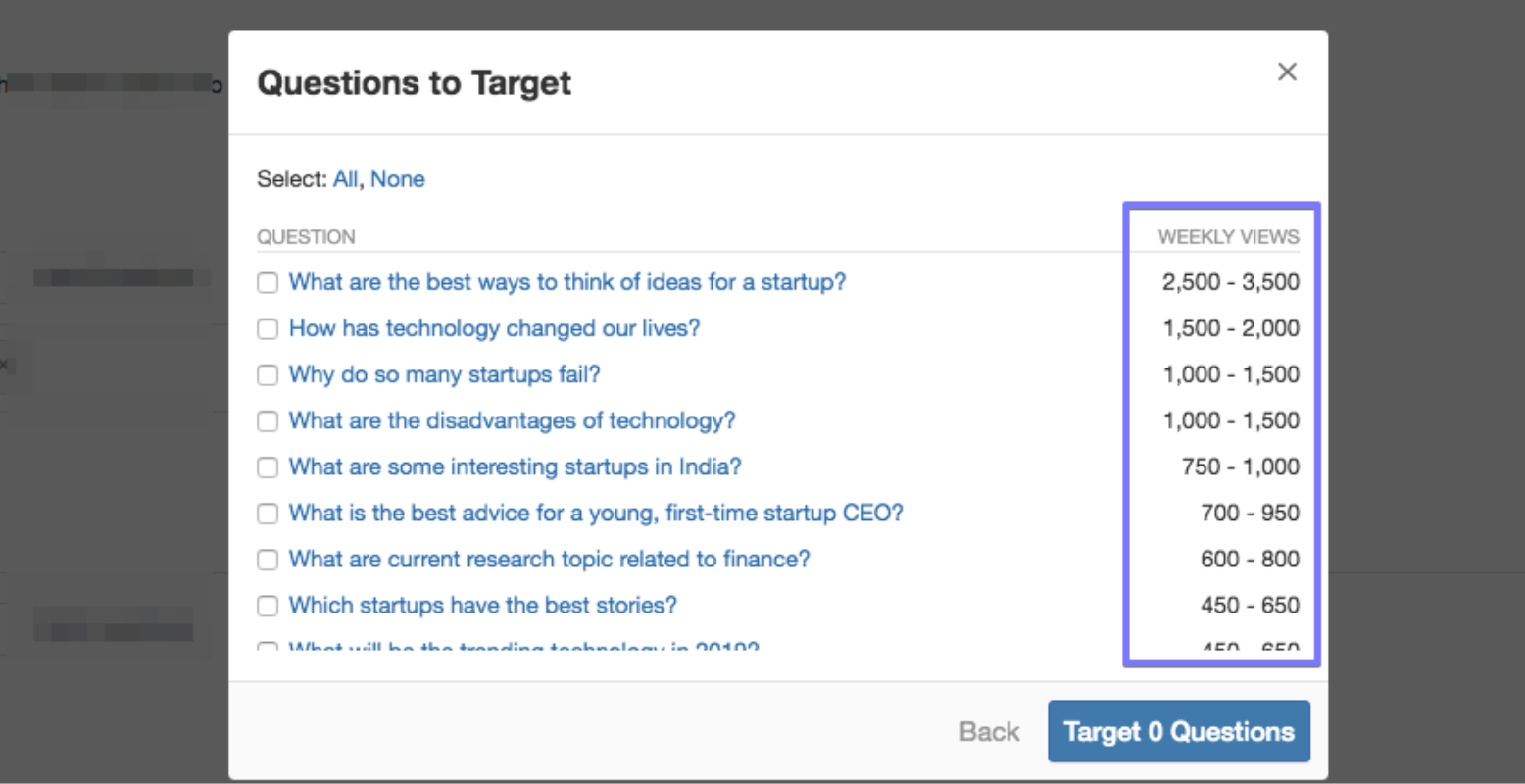 From there, enter a few keywords related to your industry and Quora will show you how many views the top questions pick up: