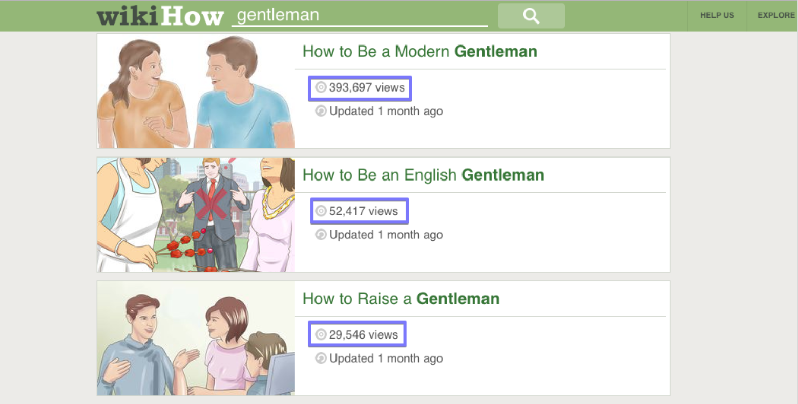 SimilarWeb estimates 85% of traffic that goes to Wikihow is from search engines. Therefore, we can confidently assume that if a phrase such as ‘How to be a modern gentleman’ has 393,697 views it’s a popular term searched for on Google.