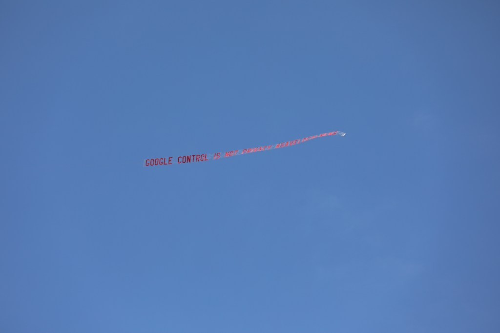 It wouldn’t be a Google I/O without a little bit of controversy. In the middle of today’s keynote, a plane started circling the amphitheater where Google holds its annual conference, towing a protest banner. “Google control is not privacy #savelocalnews,” the banner read.