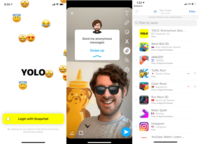 There’s a new teen app sensation. Anonymous question-asking app YOLO has rocketed to the #1 US app position just a week after launching thanks to Snapchat. Built on top of the Snap Kit platform, YOLO uses Snapchat for login and Bitmoji profile pics to let you add an “ask me anything” sticker to your Snapchat Story. Friends can swipe up to open YOLO on iOS and send an anonymous question there that you then answer through another sticker posted to your Story. One source says “EVERYONE at my high school is using it right now.” And what’s crazy is that YOLO’s inventor tells me the whole thing was an accident.