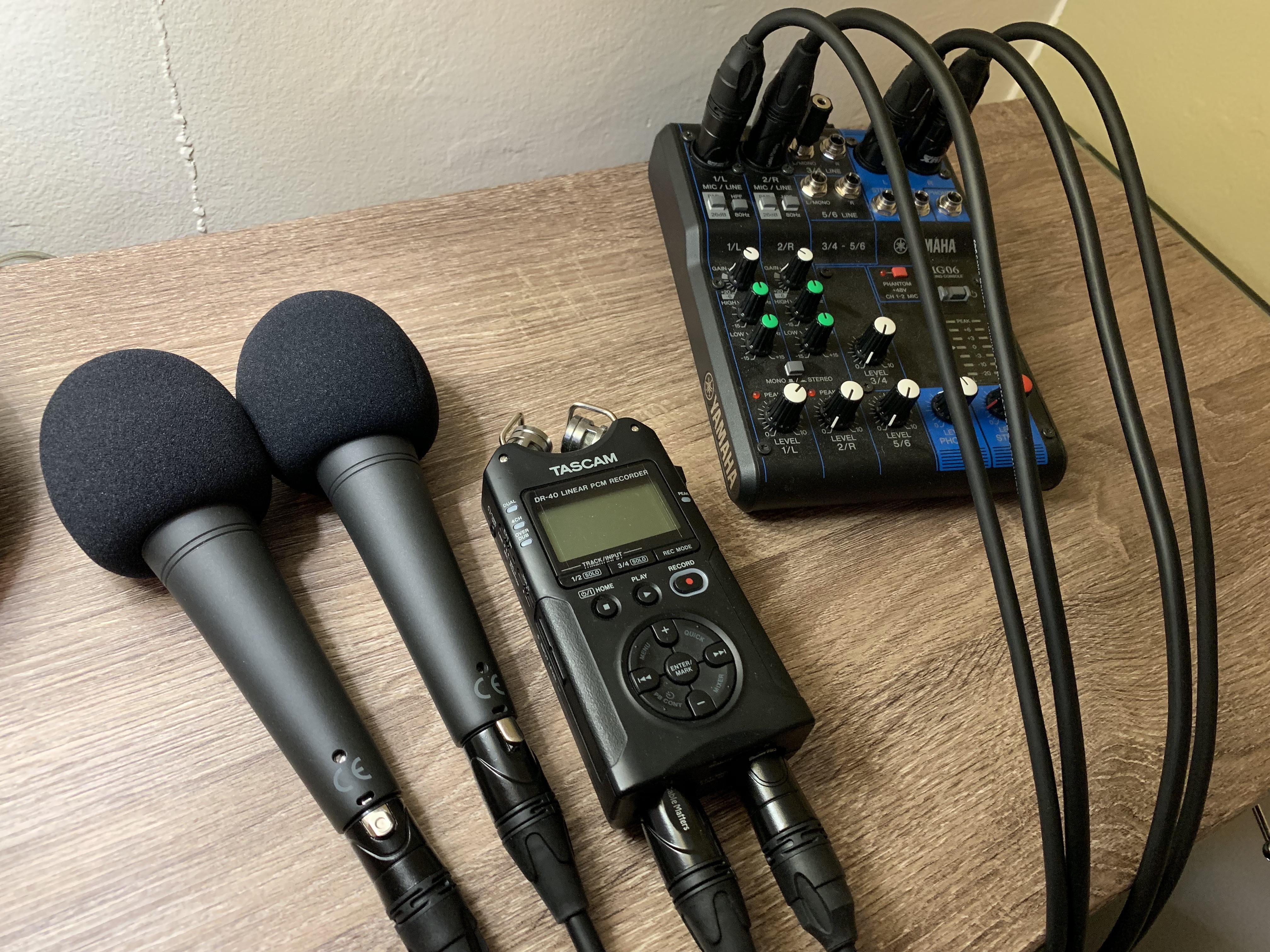So, I picked up a couple of Shure-48s (cheaper than 58s, and for talking only, just as good) and a Yamaha MG-06 Stereo Mixer. This was about $200 total, which was the most I’ve ever spent at once on podcasting equipment. The mixer’s light and easy to pack, and the Shure mics are rock solid.
