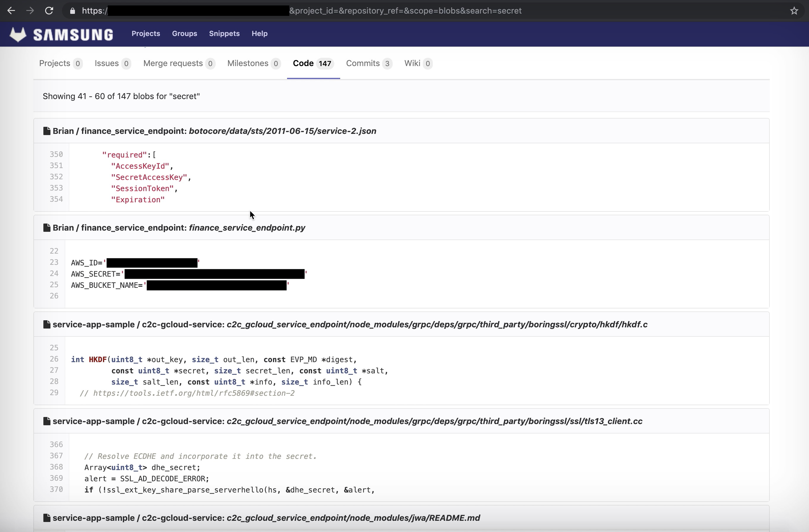 Many of the folders, he said, contained logs and analytics data for Samsung’s SmartThings and Bixby services, but also several employees’ exposed private GitLab tokens stored in plaintext, which allowed him to gain additional access from 42 public projects to 135 projects, including many private projects.