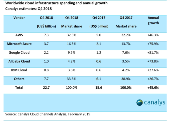 For comparison, Canalys, another firm that tracks the cloud infrastructure market has similar numbers and breaks out the specific growth rates. Note that its chart does not include Tencent.