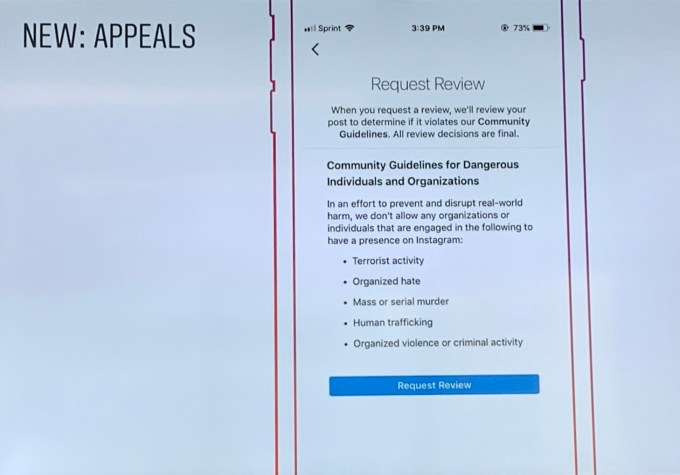 A new in-app interface (rolling out starting today) over the next few months will let users “get a second opinion on the post,” says Instagram’s head of policy, Karina Newton. A different Facebook moderator will review the post, and restore its visibility if it was wrongly removed, and they’ll inform users of their conclusion either way. Instagram always let users appeal account suspensions, but now someone can appeal a takedown if their post was mistakenly removed for nudity when they weren’t nude or hate speech that was actually friendly joshing.