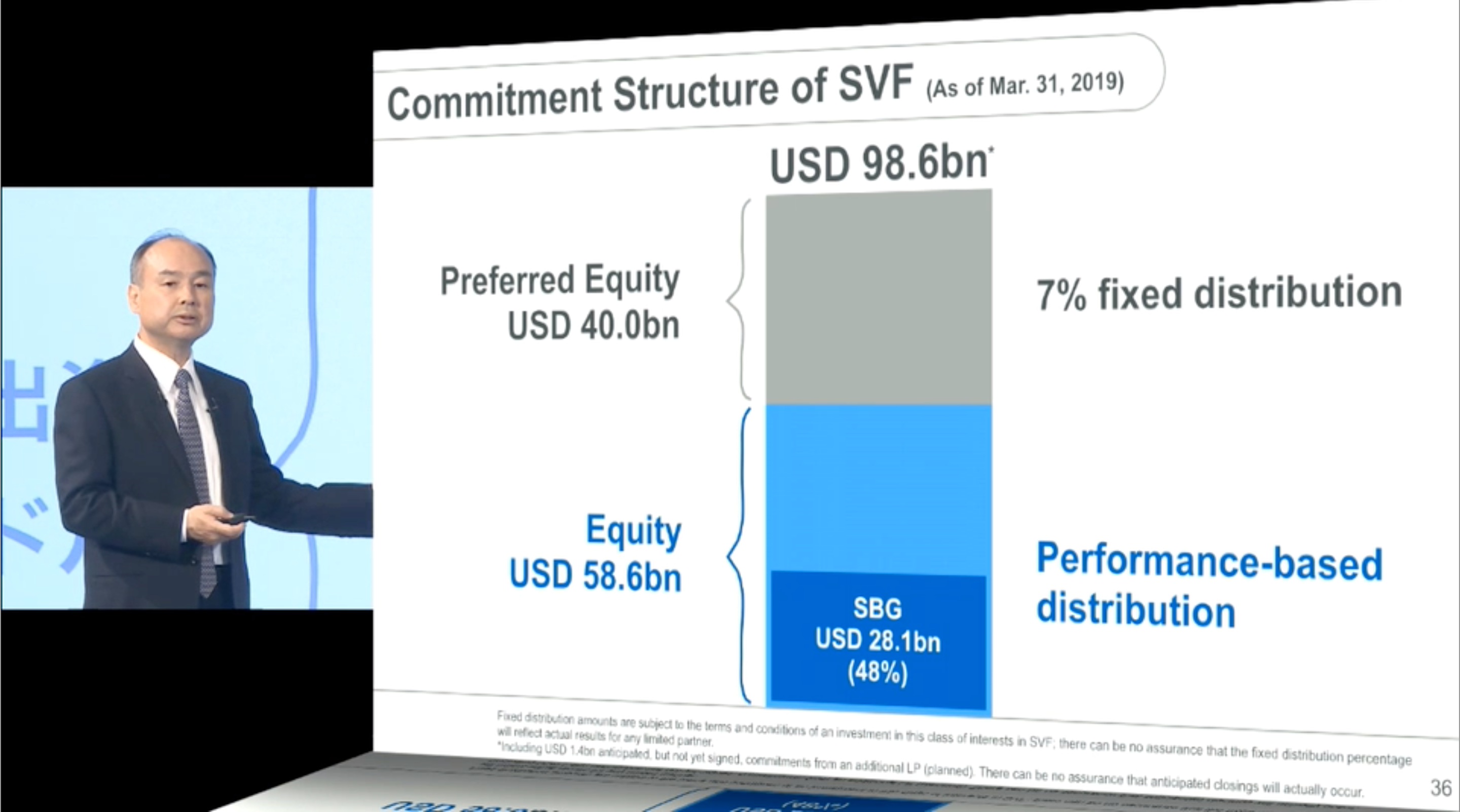 The Vision Fund is fascinating for many reasons — not to mention its insane $100 billion size — and Son detailed that LPs in the fund cover two different bands. One set has a fixed distribution of 7% through preferred equity, which covers $40 billion. The remaining $58.6 billion of regular equity pays out based on fund (portfolio) performance which, Son revealed, is at 45% (after fees) two years into the Vision Fund’s life.