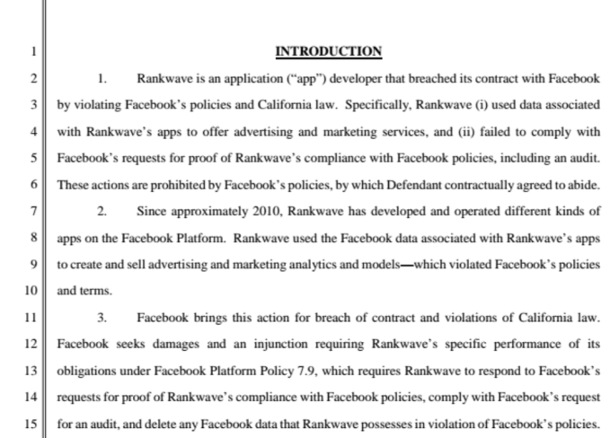 TechCrunch has attained a copy of the lawsuit that alleges that Rankwave misused Facebook data outside of the apps where it was collected, purposefully delayed responding to a cease-and-desist order, claimed it didn’t violate Facebook policy, lied about not using its apps since 2018 when they were accessed in April 2019, and then refused to comply with a mandatory audit of its data practices. Facebook Platform data is not supposed to be repurposed for other business goals, only for the developer to improve their app’s user experience.