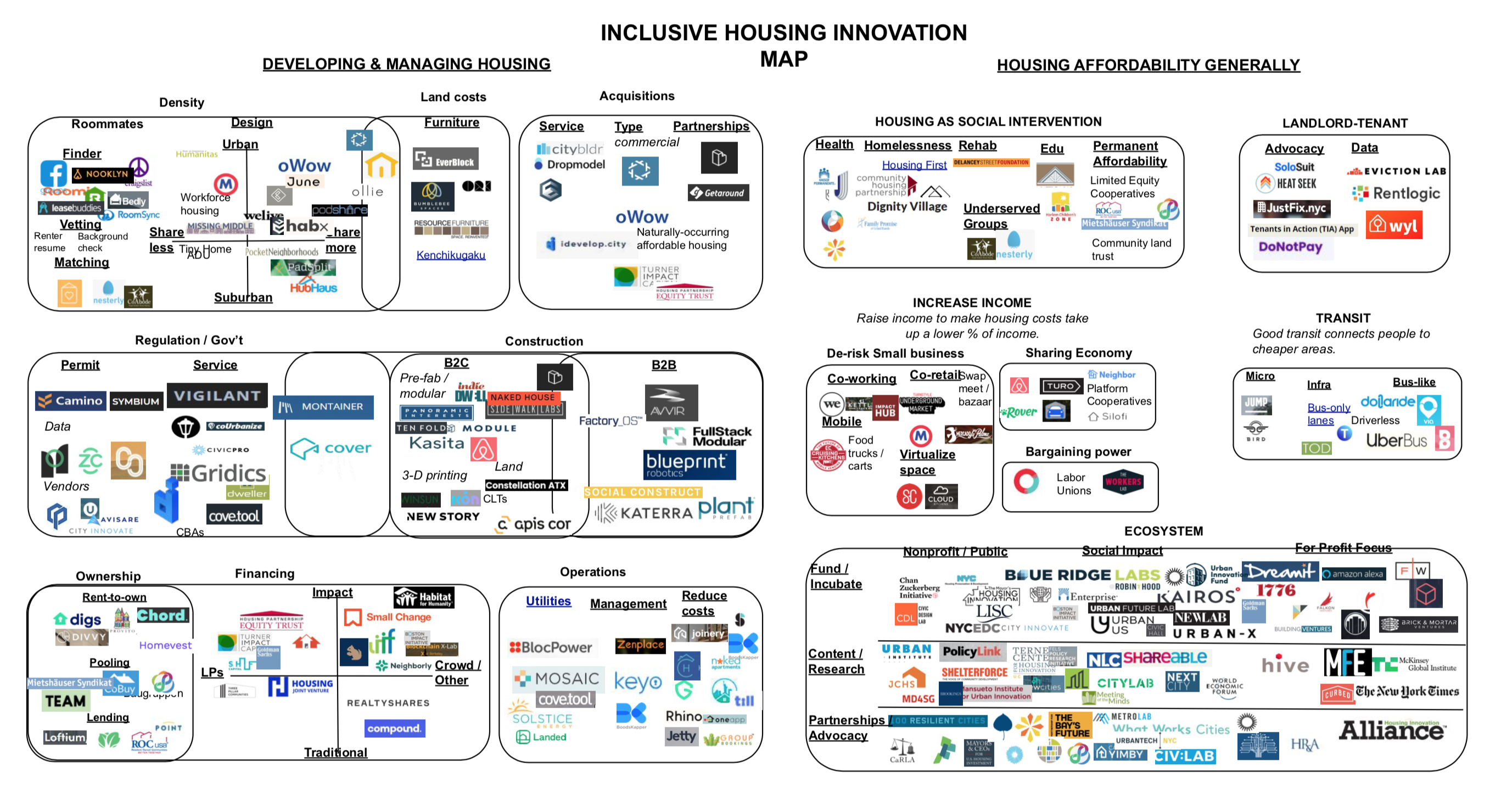 To make sense of this broad field, I categorize innovations into two main groups, which I detail in two separate pieces on Extra Crunch. The first (Part 1) identifies the key phases of developing and managing housing. The second (Part 2) section identifies interventions that contribute to housing inclusion more generally, such as efforts to pair housing with transit, small business creation and mental rehabilitation.