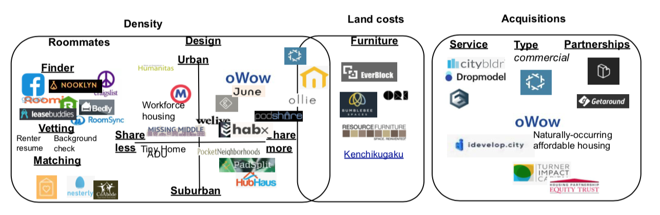 The second axis is a rough measure of how much is being shared. For instance, companies that share more are more likely to share bathrooms, kitchens, and other furnishings, which result in further cost savings. These include PadSplit, HubHaus, and Starcity. Podshare and HomeShare go even further. PodShare tenants live in “bed pods” that lack doors or walls, while Homeshare allow some tenants to live in living rooms converted into bedrooms divided by cubicle-like partitions. In contrast, tenants in ADUs, tiny homes, and more expensive co-living units (such as WeLive) tend to share less, often having their own bathrooms, kitchens, and even living rooms.