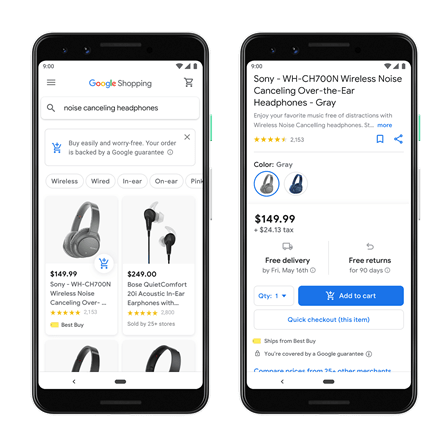 Some items will also include a blue shopping cart button that, when clicked, will allow the consumer to add the item in question to a universal cart where the purchase is backed by a Google guarantee, plus customer service and easy returns.