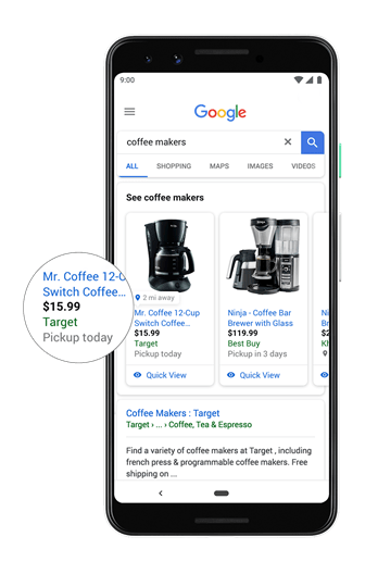 In addition, Shopping ads are being updated to drive in-store pickup traffic. That is, when consumers shop online and click through to buy from a Shopping ad, they will have an easier way to purchase items for in-store pickup. This beta feature requires merchant participation, however. The retailer will need to have product landing pages on their sites that show when in-store pickup is available, as well as a local inventory feed in the Merchant Center that shows which items are in stock, and optionally a list of items that can be quick-shipped to a local store.